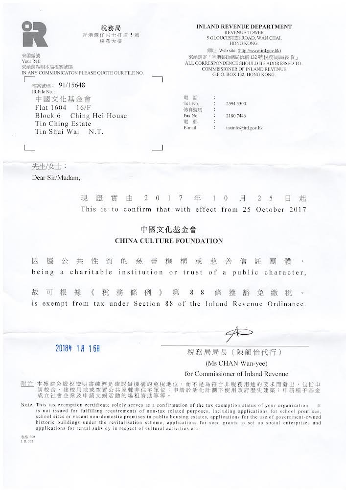 The China Culture Foundation is a tax-exempt charity under section 88 of the Inland Revenue Ordinance,Hong Kong