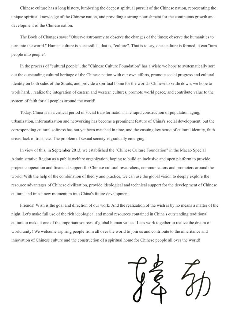 China Culture Foundation (CCF) is a worldwide non-profit organization established on November 25,2013 under the approval of the Government of the Macao Special Administrative Region. CCF is composed of two general headquarters in Macao and Beijing, along with branch offices located in the United States,Hong Kong,Korea, France, Australia and etc.